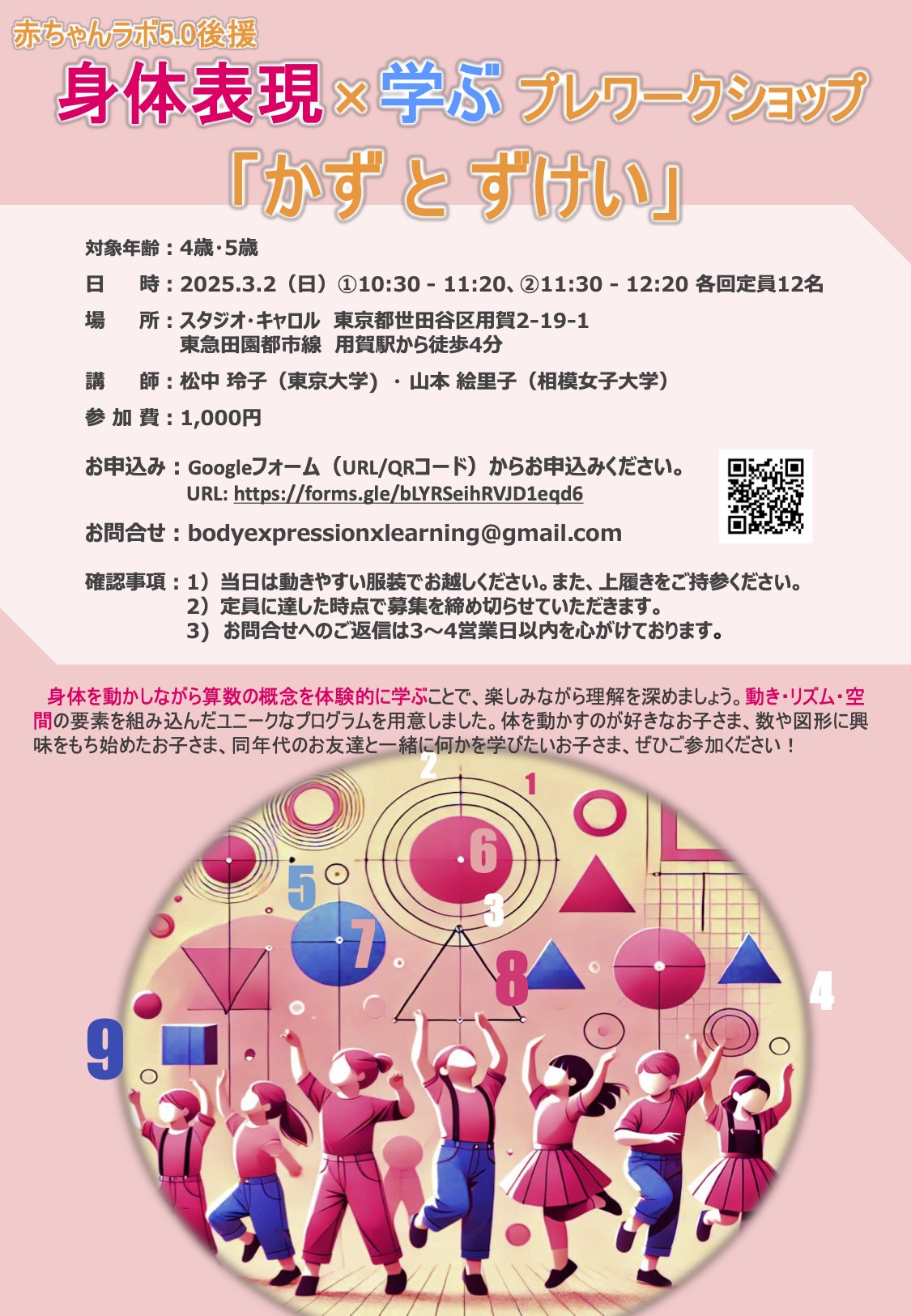 数や図形を机の上だけではなくもっと広い世界で学びませんか?このプレワークショップでは、身体を動かしながら算数の概念を体験的に学ぶことで、楽しみながら理解を深めます。日頃の発達認知科学、物理学、創作舞踊の教育・研究成果をいかして、動き・リズム・空間の要素を組み込んだユニークなプログラムを用意しました。体を動かすのが好きなお子さま、数や形に興味をもち始めたお子さま、同年代のお友達と一緒に何かを学びたいお子さま、ぜひご参加ください!